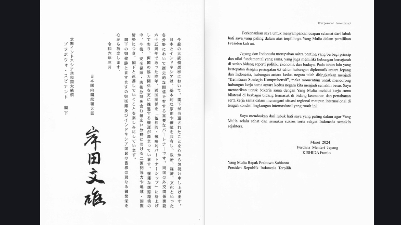 Kishida memberikan ucapan selamat kepada Prabowo melalui sambungan telepon pada Kamis (21/3) pada pukul 14:30 (WIB) selama kurang lebih 10 menit. Selain via telepon, ucapan tersebut juga diutarakan melalui surat resmi.